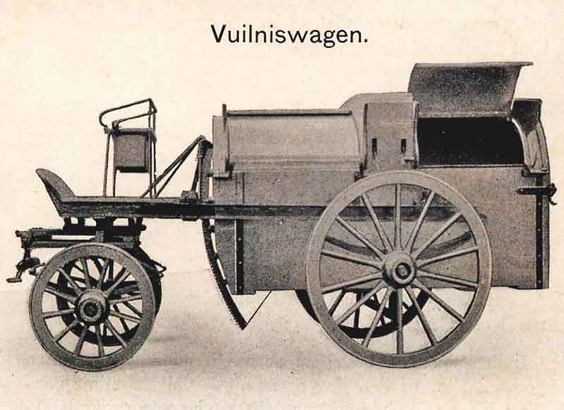 Schiedam kreeg in 1898 een gemeentelijke reinigingsdienst met materieel uit de eerste gespecialiseerde fabriek. En jawel, deze stond ook in Schiedam! Hier een afbeelding van een vuilniswagen van Wagenmakerij Arij Jordaans.