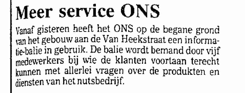 Schiedam maakte al heel vroeg gebruik van de Europese Communicatie Satelliet. Eén van de eerste schotelantennes van Nederland stond op het ONS-terrein. Het bracht alle circa 40 Nederlandse kabeldirecteuren naar onze gemeente voor een vergadering over de toekomst van deze moderne manier van communicatie. In 1988 startte de ONS met het doorgeven van de Avondbladen TV-krant.